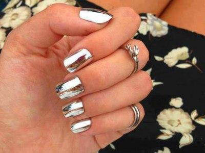 Второй вариант зеркального маникюра – фольга. Если правильно её использовать, то фольга даст наиболее близкий к накладным ногтям результат, то есть идеально ровное и гладкое зеркало. Хотя с её помощью маникюр и выглядит менее эстетично, в то же время смотрится гораздо естественнее. Такой маникюр сложно выполнить с первого раза, и занимает он гораздо больше времени.